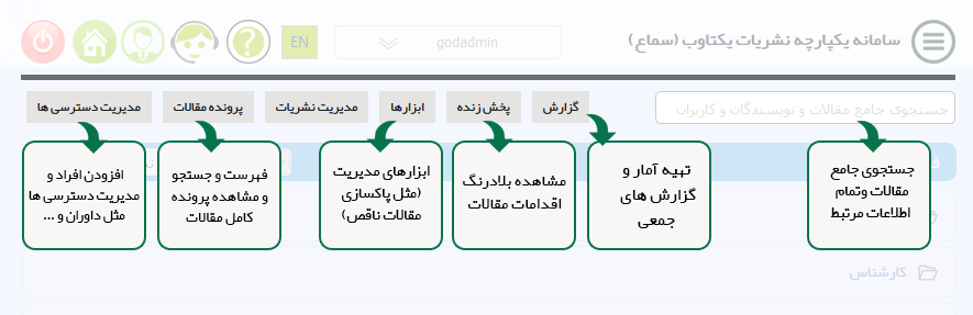 این سامانه به هر فرد تنها یک نام کاربری و رمز عبور اختصاص می دهد و با همان نام کاربری می تواند به همه نقش های خود در همه نشریات دسترسی داشته باشد. توضیحات هر بخش از این سامانه در تصاویر زیر ارایه شده است.نسخه اولیه این سامانه برای مقالات عرضه شده است. اما با داشتن امکان تغییر و تنظیم نقش ها و عناوین، امکان استفاده از آن برای بررسی هر نوع سندی وجود خواهد داشت.